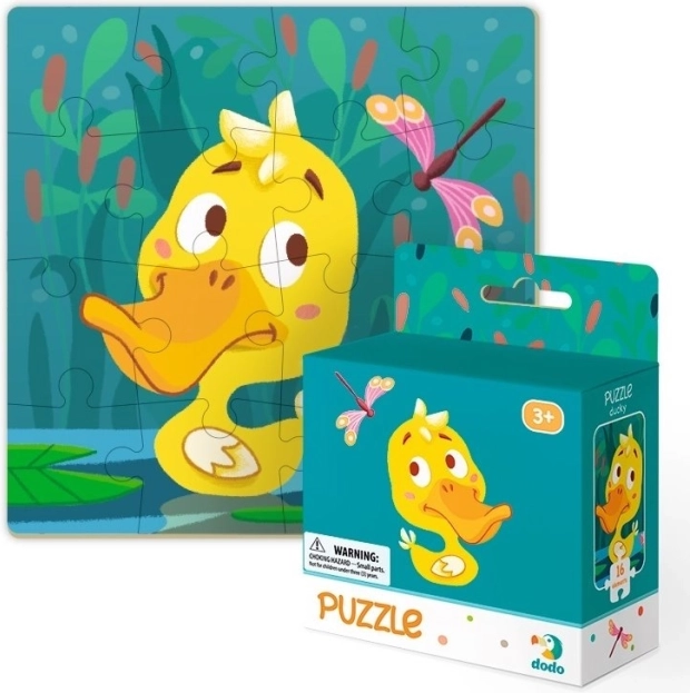 Roztomilé dětské puzzle s motivem kačenky nabízí 16 dílků a po složení má rozměr přibližně 22 × 22 cm — kvalitní značka DODO.