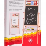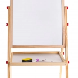 Velká dřevěná, oboustranná tabule pro děti od 3 let nabízí bílou magnetickou whiteboard stranu a černou křídovou tabuli. Nechybí počítadlo, učební hodiny a matematická skládačka, praktická polička a nastavitelná výška. V balení jsou fix s gumou, barevné křídy a houbička – vše pro kreativní psaní, kreslení a učení hrou.