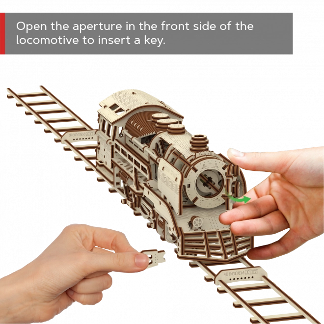 Lokomotiva využívá gumičkový motor a ozubená kola, takže po natažení skutečně jezdí dopředu i dozadu. Převody a pistony uvidíte přímo v akci.