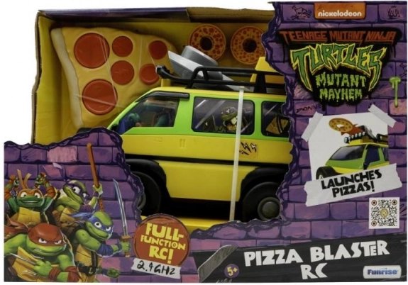 RC auto Pizza Blaster je vybaveno 2,4 GHz technologií pro snadnou a plynulou jízdu. S tímto vozidlem můžete vystřelovat až 6 pěnových pizz na své nepřátele a užít si tak dravou bitvu jako praví Želvy Ninja! Vtipný dálkový ovladač ve tvaru plátku pizzy přidává extra dávku zábavy a jednoduchosti ovládání.