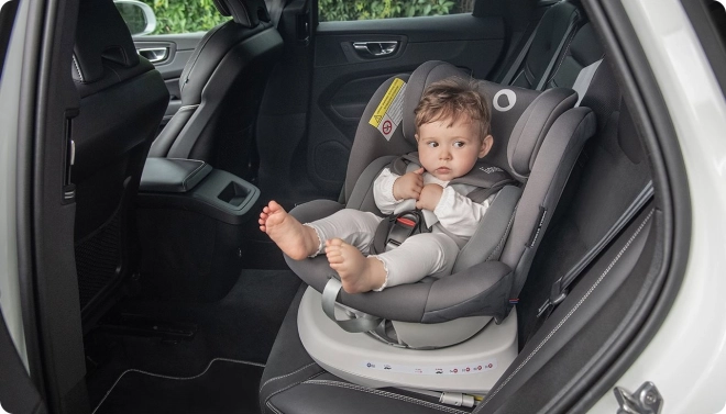 Jedním pohybem otočíte sedačku směrem ke dveřím, dítě pohodlně připoutáte a poté nastavíte směr jízdy.