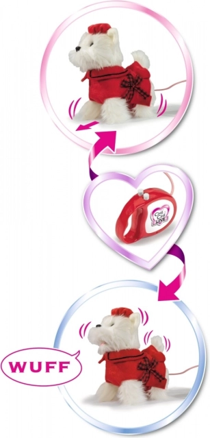 Interaktivní plyšový West Highland teriér CHI CHI LOVE Poshi je stvořený pro malé milovníky zvířat. Stylový červený outfit s mašlí dodává pejskovi šmrnc a ergonomická rukojeť vodítka zajišťuje pohodlné vedení. Díky propojení kabelem pejsek spolehlivě reaguje na pokyny – zvládá chůzi, štěkání i vrtění ocáskem.