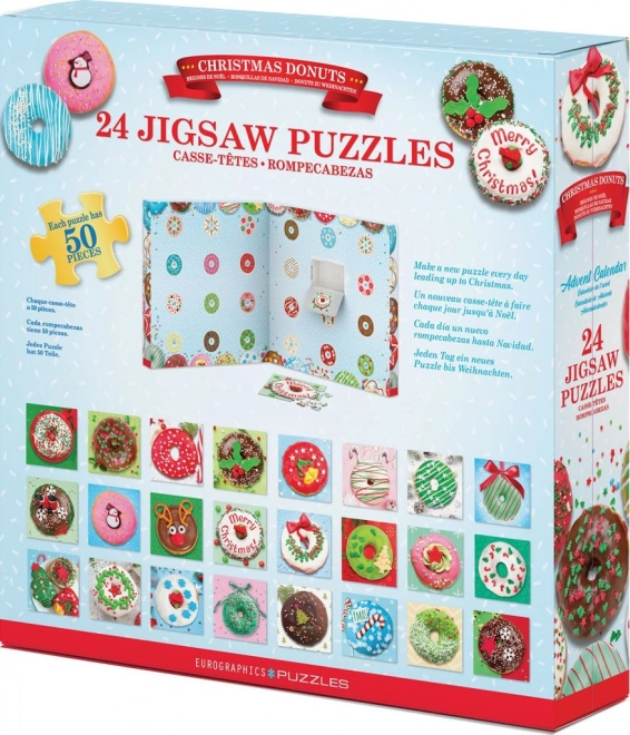 Zkraťte si čekání na Štědrý den s originálním adventním kalendářem EUROGRAPHICS, který ukrývá 24 samostatných puzzle s vánočními motivy. Každé puzzle má 50 dílků, čtvercový formát a rozměr 12,5 × 12,5 cm. V každém okénku najdete i předlohu obrázku. Kalendář je navíc znovupoužitelný – příští rok si s ním snadno vytvoříte vlastní adventní kalendář naplněný drobnostmi. Skvělá zábava pro děti i dospělé a každodenní dávka vánoční atmosféry.