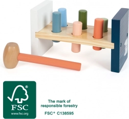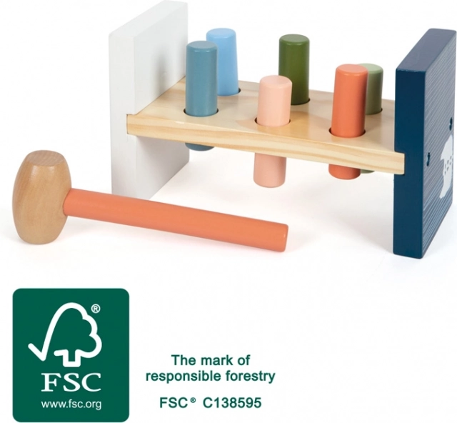 Tato kvalitní zatloukačka z FSC® 100% dřeva je ideální pro první dovednosti malých stavitelů. Děti dřevěným kladívkem zatloukají barevné válečky do lavice a po dokončení hru snadno obnoví jednoduchým otočením. Boční potisk s ledním medvědem dává vizuální smysl i při hraní vzhůru nohama.