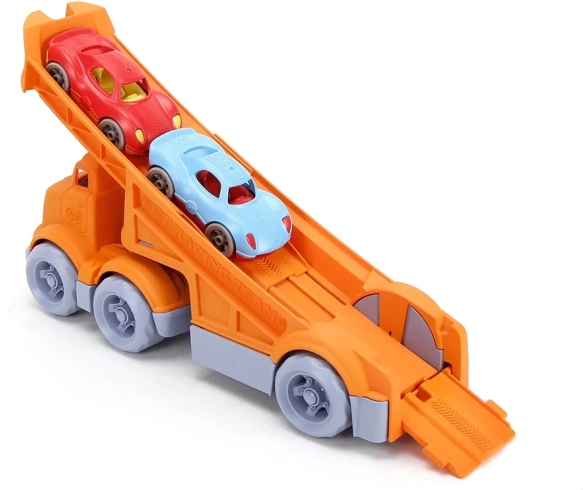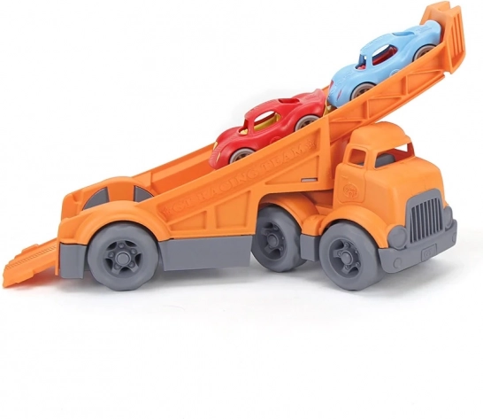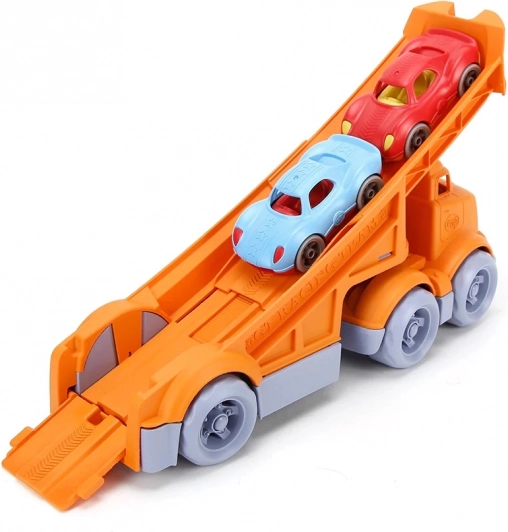 Ekologický dopravní set od Green Toys přináší bezpečnou a zábavnou hru pro nejmenší. Robustní oranžový kamion s dlouhou nájezdovou rampou převáží dvě barevná závodní autíčka. Vyrobeno z recyklovaného plastu z lahví od mléka, bez BPA, ftalátů a PVC, vhodné na doma, pískoviště i do vody. Jednoduchá údržba – lze mýt v myčce.