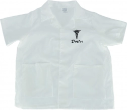 Bílý lékařský plášť s krátkými rukávy, dvěma kapsami a caduceus symbolem s nápisem 'Doctor'.