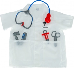 Obsahuje lékařský plášť a zdravotnické nástroje: stetoskop, nůžky, injekční stříkačku, teploměr a reflexní kladívko.