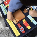 Obsahuje 14 různorodých prvků, mezi které patří zipy, přezky, knoflíky a další, které podporují praktické dovednosti a samostatnost.