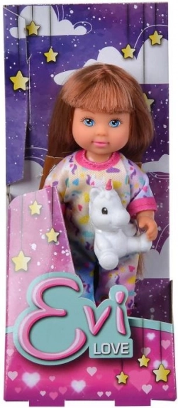 Roztomilá panenka Evička v měkoučkém pyžamu a s plyšovým jednorožcem potěší každé dítě. Tři různá provedení, ideální pro kreativní a fantazijní hru. Výška panenky 12 cm, vhodné od 3 let.