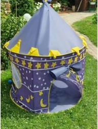 Dětský hrací stan ve tvaru modrého hradu podpoří kreativní hry a samostatnost. Stylový potisk noční oblohy se hvězdami a měsíci přitáhne pozornost a vytvoří útulný koutek pro čtení, hraní i odpočinek. Konstrukce je lehká, přesto stabilní, takže si děti užijí spoustu zábavy v bezpečí.