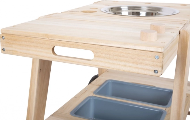 Dvě vyjímatelné misky a nerezový dřez zvou k míchání, nabírání a „vaření“. Ideální alternativa k pískovišti pro rozvoj smyslů a fantazie.