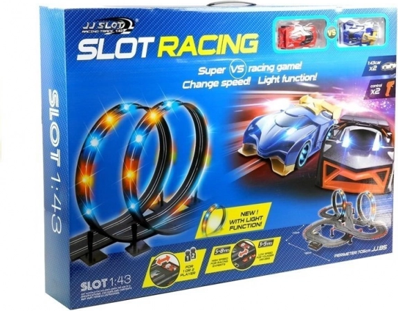 Domácí závody jako nikdy předtím! Tento slotový závodní set přináší rychlost, adrenalin a férové soupeření pro dva hráče. Obsahuje 2 závodní autíčka v měřítku 1:43, ovládací pult s přepínači rychlosti, počítadlo kol a efektní LED smyčky, které rozsvítí každou jízdu.