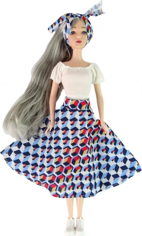 Objevte půvab panenky EMILY s dlouhými šedými vlasy, jasnýma modrýma očima a sladěnou čelenkou. Nosí bílý top a rozšířenou sukni s geometrickým vzorem, které doplňují bílé boty. Součástí je roztomilé koťátko a bílá houpačka – ideální pro nápadité scénky a péči o mazlíčka.