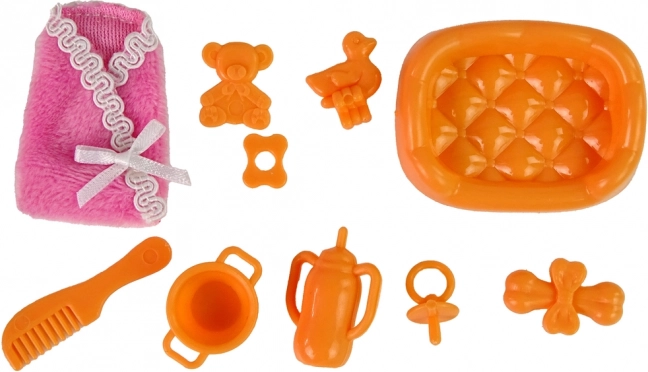 Set obsahuje různé doplňky jako je hřebínek, kachnička do koupele a dětská lahvička, které zvyšují možnosti hry.