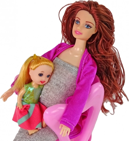 Těhotenská panenka s úžasnými doplňky, ideální pro děti, které si rády hrají na rodiče! Panenka má dlouhé hnědé vlasy, modré oči a je oblečená v šedých šatech s růžovým svetříkem a růžovými botami.