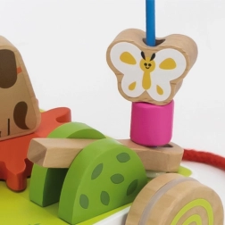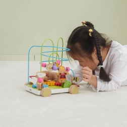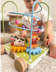 Tato kreativní dřevěná hračka na kolečkách přináší dětem nekonečné možnosti objevování. Na pevné základně najdete figurky farmáře, kravičky a pejska, pestrobarevnou motorickou smyčku s korálky, sluníčkem a motýlkem i otočná ozubená kolečka. Zvířátka lze snadno měnit a přesouvat, takže si děti vytvářejí vlastní příběhy a trénují jemnou motoriku.