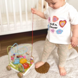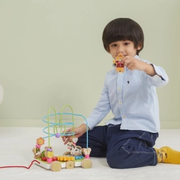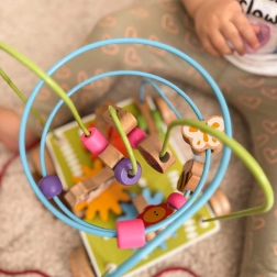 Jedna hračka, spousta možností – děti mohou hračku tahat za šňůrku, posouvat korálky po kovových drátech a otáčet ozubenými kolečky. Kombinuje pohyb i smyslovou hru.