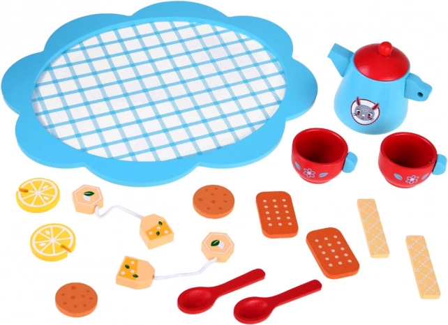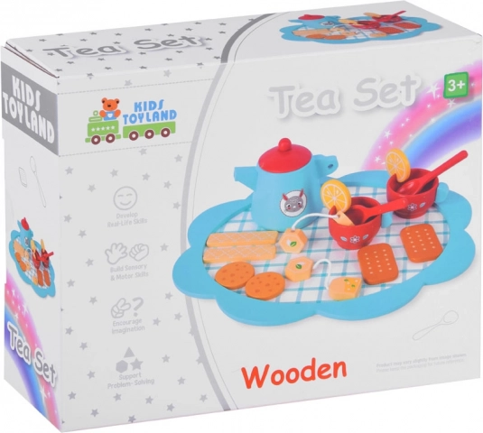 Roztomilá dřevěná čajová sada pro děti v modrých odstínech přináší vše pro malou čajovou party: tác, konvičku, šálky, lžičky i sušenky a citron. Je vyrobena z odolného dřeva a opatřena bezpečnými, netoxickými barvami, takže je ideální pro rolové hry, rozvoj fantazie a jemné motoriky dětí od 3 let.