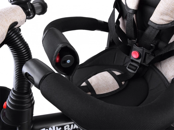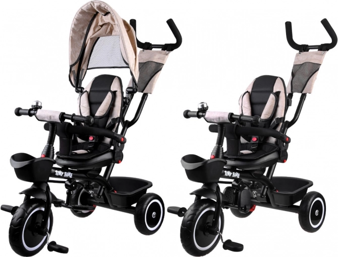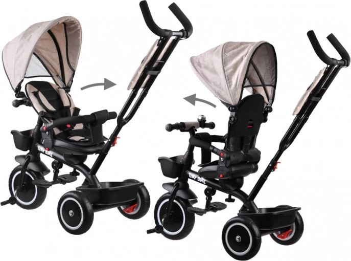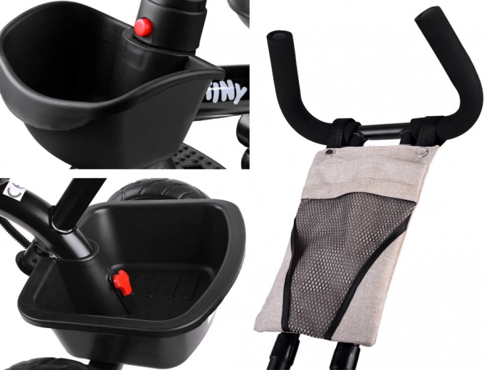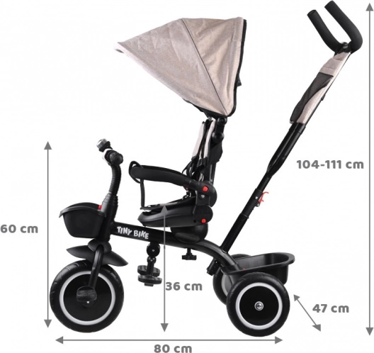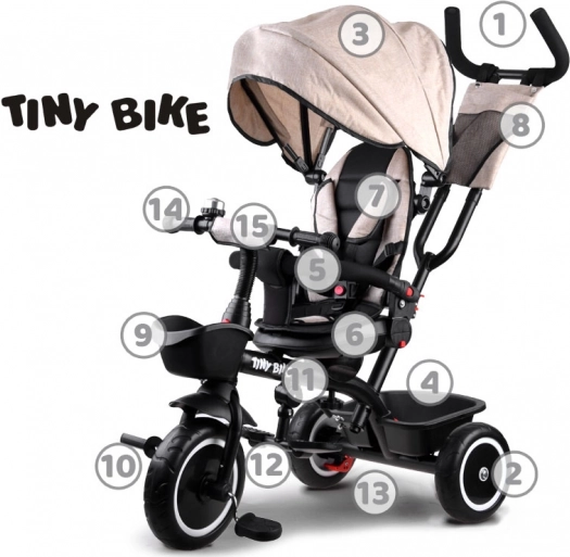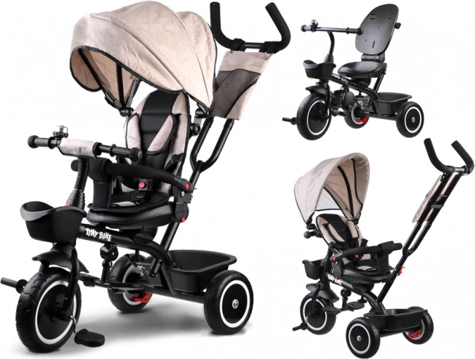 Praktická dětská tříkolka 3v1 TINY BIKE roste s vaším dítětem od 6 měsíců do cca 5 let. Nabízí otočné a polohovatelné sedadlo, sluneční stříšku se síťkou, 5bodové bezpečnostní pásy, rodičovské řízení s nastavitelnou výškou a bezúdržbová kola z EVA pěny. Díky pevné ocelové konstrukci a bohaté výbavě je ideální na každodenní vycházky.