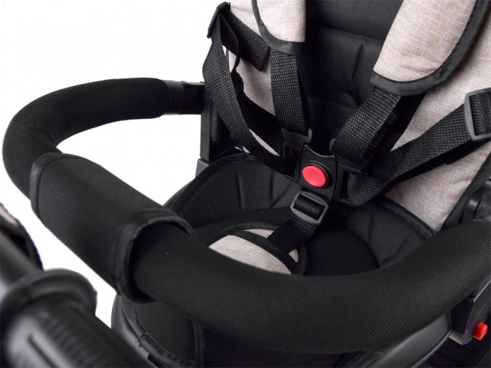 - Bezpečnost: 5bodové pásy, měkká bariérka, protiskluzové rukojeti, zvonek