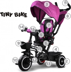 Praktická dětská tříkolka 3v1 TINY BIKE s otočným sedátkem a sluneční boudičkou roste s vaším dítětem od 6 měsíců do 5 let. Nabízí pohodlí, 5bodové pásy, skládací boudičku se síťkou, rodičovské řízení a bezúdržbová EVA kola pro bezpečné a plynulé vyjížďky.