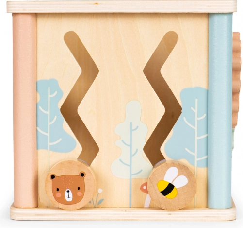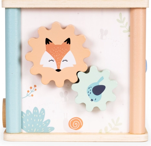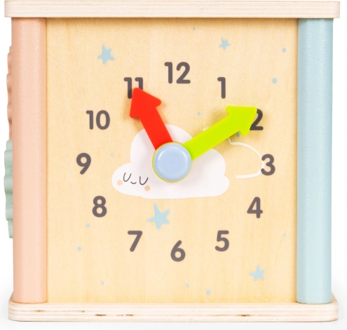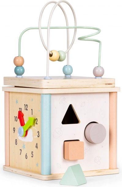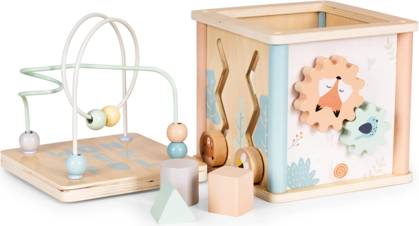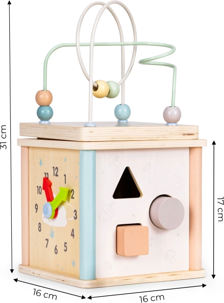 Multifunkční dřevěná aktivní kostka ECOTOYS přináší dětem zábavu i učení v jednom. Nabízí kuličkový labyrint, otáčecí ozubená kola, hodiny s pohyblivými ručičkami a sortér tvarů s barevnými kostkami. Rozvíjí jemnou motoriku, koordinaci oko–ruka, rozpoznávání barev a tvarů a podporuje samostatnou hru. Bezpečné provedení a příjemné pastelové barvy potěší děti i rodiče.