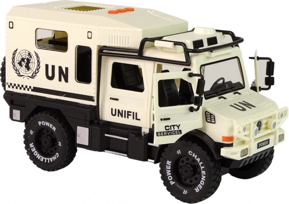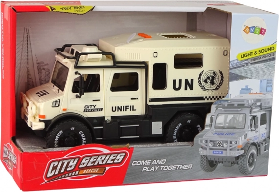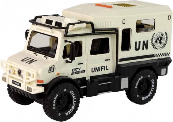 Tento robustní terénní vůz v elegantní béžové barvě přináší spoustu akce a zábavy. Po stisknutí jednoho ze tří tlačítek na střeše se rozsvítí přední LED světla a ozvou se zvuky sirény, které umocní realistický zážitek ze hry. Otevírací dveře podporují kreativní příběhy a rozvíjejí dětskou představivost.