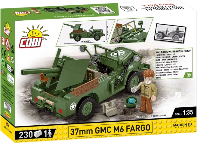 37 mm GMC M6 Fargo je americké lehké obrněné vozidlo používané během druhé světové války. Vyvinuté na podvozku nákladního vozu Dodge WC, bylo vybaveno 37 mm protitankovým kanónem M3, což ho činilo efektivním v boji proti lehkým obrněncům a opevněním. Tento kostičkový model od značky COBI je vyroben v měřítku 1:35 a skládá se z 230 dílků.