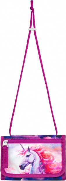Tato lehká peněženka s kouzelným motivem jednorožce potěší každé dítě. Díky šňůře ji lze pohodlně nosit na krku, takže je stále po ruce a zároveň v bezpečí. Odolný textilní materiál snese každodenní používání ve škole, na kroužcích i na výletech.