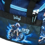 Lehká a praktická dětská sportovní taška BAAGL s motivem motorky je ideální na kroužky, tréninky i jako příruční zavazadlo. Nabízí prostornou hlavní komoru se širokým víkem pro snadné balení, samostatnou kapsu na obuv, odnímatelný nastavitelný popruh pro nošení přes rameno a vyztužené voděodolné dno. O plynulý chod se starají spolehlivé zipy YKK a reflexní prvky zvyšují bezpečnost dětí za šera.
