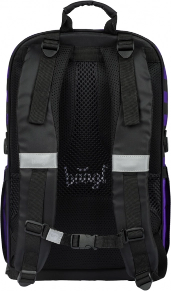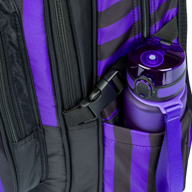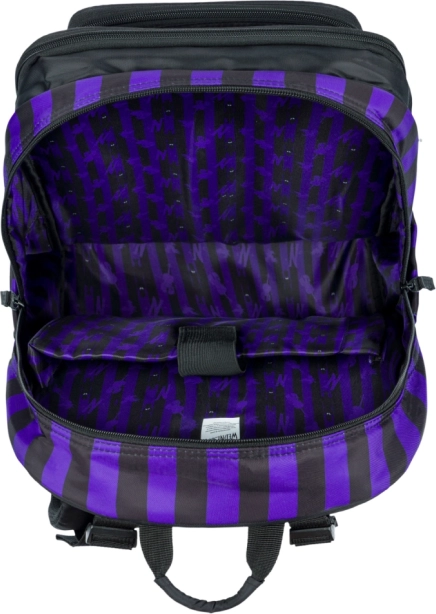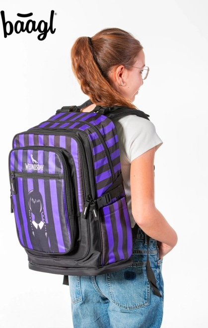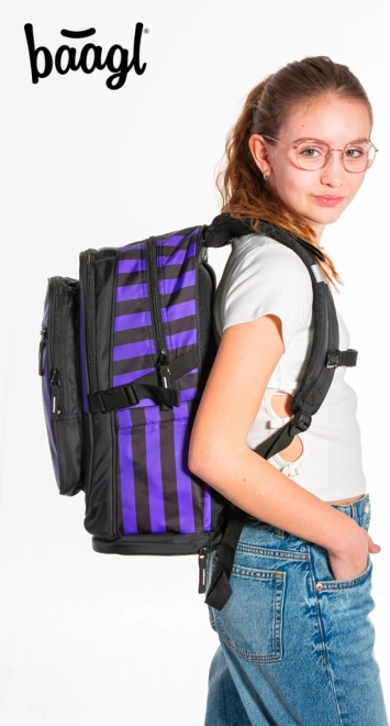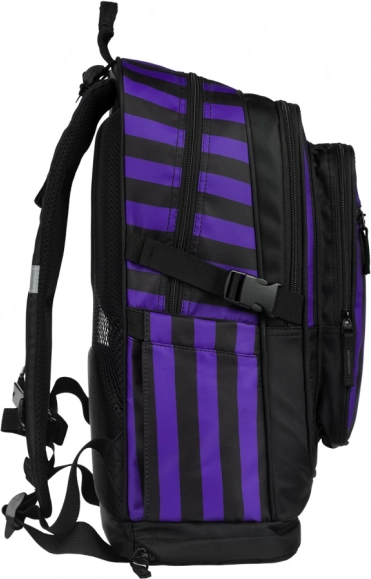 Set Cubic Wednesday obsahuje stylový batoh, praktický penál a sáček na obuv, vše v moderním designu s černými a fialovými pruhy. Batoh je navržen tak, aby splňoval ergonomické potřeby, zatímco penál a sáček zajišťují organizaci školních pomůcek a volnočasových aktivit.