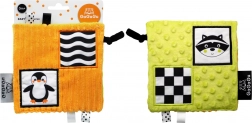 Oboustranný design přináší dvě atraktivní ilustrace – tučňáka a mývala – a množství detailů pro zkoumání: stužky, plyšová poutka a větší štítek pro snadnější uchopení. Tyto prvky podporují koordinaci oko–ruka a cvičení jemné motoriky.