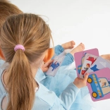 Součástí balení jsou inspirativní tipy na aktivity: první hledání dvojic, příběhové hry, napodobování zvuků dopravních prostředků, malování podle karet a cvičení postřehu. Hra podporuje rozvoj jemné motoriky, poznávání světa i komunikačních dovedností.