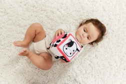 Vysoký kontrast černobílých motivů s barevnými detaily stimuluje zrak a udrží pozornost miminka během hry.