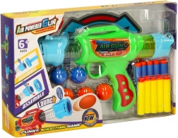Pistole, pěnové náboje ×10, pěnové kuličky ×6, terč k vystřižení