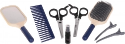 Nůžky, efilační nůžky, hřeben, kartáč, zrcátko, sponky, stojánek a nádobka na kosmetiku – vše pro kreativní účesy na jednom místě.