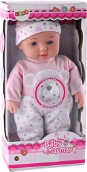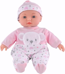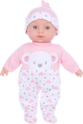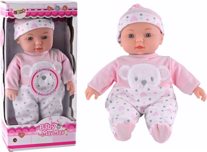 Roztomilá panenka miminko v růžových dupačkách s medvídkem a čepičkou potěší každé dítě. Po stisknutí měkkého bříška vydává realistické zvuky miminka, podporuje kreativní hru, péči a zodpovědnost. Vyrobena z bezpečných materiálů, vhodná od 12 měsíců, s certifikací CE a normou EN71.