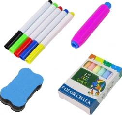 Součástí sady je vše, co děti potřebují pro okamžitou hru: pět fixů v různých barvách, dvanáct barevných kříd, houbička, praktický držák na křídu proti ušpinění rukou a sada magnetů s písmeny, číslicemi a symboly. Díky kompaktním rozměrům je tabule vhodná do dětského pokoje i herního koutku.