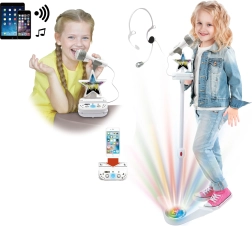 S touto Bluetooth karaoke sadou si užijete spoustu zábavy. Obsahuje karaoke modul, stojan s mikrofonem a hlavový mikrofon, který zajistí stabilní a pohodlný zpěv i při pohybu. Ovládací panel je vybaven stojánkem na mobil nebo MP3 přehrávač, takže můžete snadno sledovat texty nebo videa.