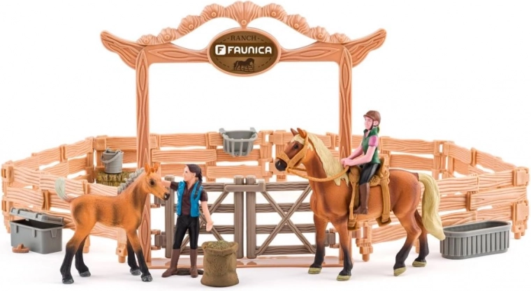 Balení obsahuje vše potřebné: koně, figurky, ohradu i doplňky pro krmení. Ideální start do světa jezdectví a hraní na farmu.