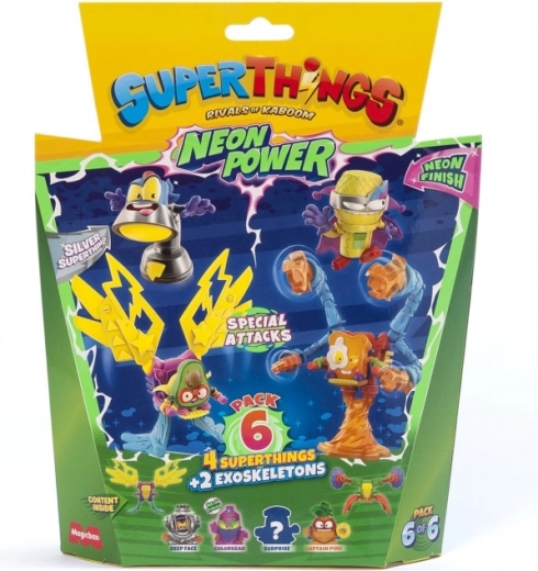 Vstupte do města Kaboom a rozšiřte svou sbírku o SuperThings: Neon Power! Každé balení přináší kombinaci 4 hrdinských (nebo záporáckých) figurek a 2 exoskeletonů, které dodají vašim bitvám sílu a styl. Neonové provedení zaručí, že vaše postavy vyniknou v každé akci.
