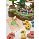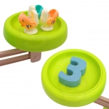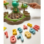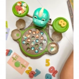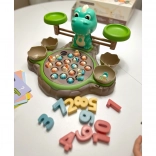 Hračka Dinozaur s váhou od WOOPIE nabízí dětem možnost prozkoumat svět čísel a matematických operací během zábavné hry s chytáním dinosaurů. Na základně je otočný talíř, ze kterého lze chytat malé dinosaury. Přepnutím tlačítka se talíř začne otáčet a poslech melodie doprovází děti při hraní. Za talířem je umístěn velký dinosaurus, který slouží jako váha, a místo pro pruty na chytání, které lze ozdobit lístky ze sady. Po stranách jsou umístěna dvě zavíratelná vejce na úkryt chycených dinosaurů.