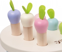 Delikátní pastelové barvy přitahují pozornost a zvyšují zájem dítěte o hračku. Hra spočívá v tréninku zručnosti dětí tím, že přesně zatloukají mrkve, které vyskočí z otvoru.