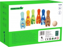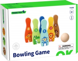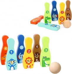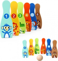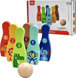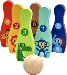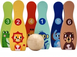 Dřevěná bowlingová sada se šesti barevnými kuželkami a míčkem je ideální hrou do dětského pokoje. Každá kuželka má zvířecí motiv a číslování 1–6, díky čemuž děti při hře přirozeně trénují počítání, poznávání barev a rozvíjejí motorické dovednosti.