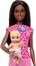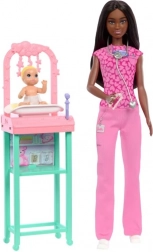 Staňte se dětskou lékařkou s Barbie a její roztomilou pacientkou! Barbie je oblečená v růžovém lékařském kompletu s motivem srdíček a připravena pečovat o zdraví a štěstí dětí.