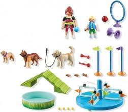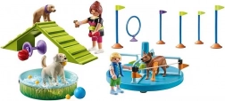 2 figurky dětí, několik psů, překážky (kruh, slalom, houpačka/kladina, rampy), doplňky