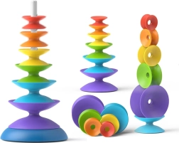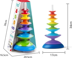 Tato vzdělávací senzorická hračka kombinuje kreativní hraní a rozvoj dovedností. Dítě může skládat 7 barevných kotoučů podle velikosti či barvy, nechávat je klouzat po spirále a neustále zkoušet nové kombinace. Stohovací věž podporuje jemnou motoriku, koordinaci ruka–oko a vnímání tvarů a barev.