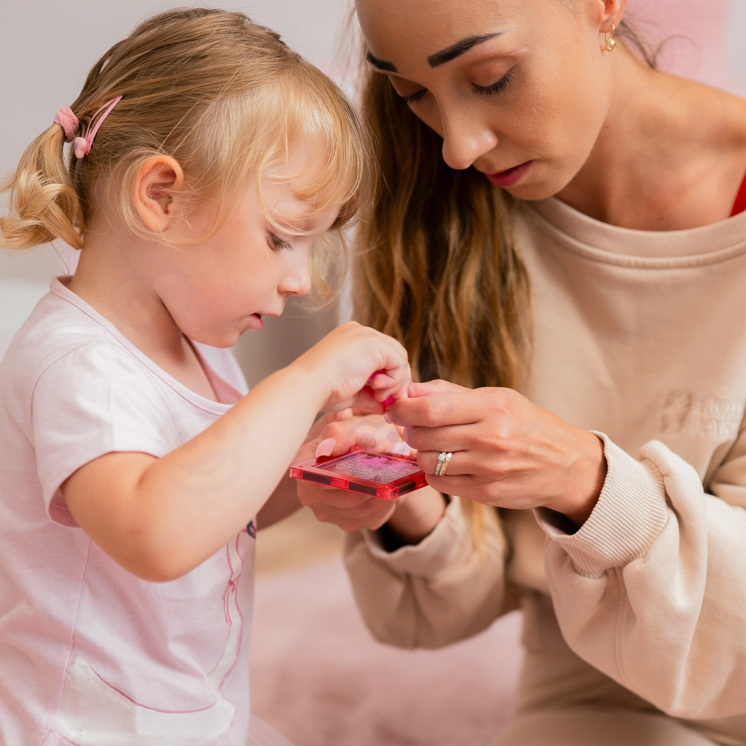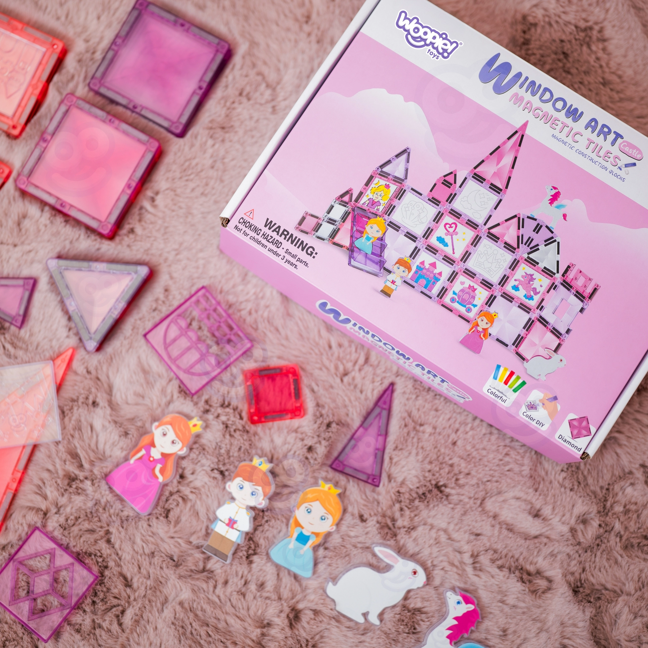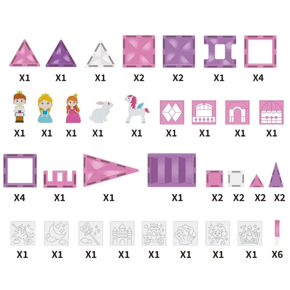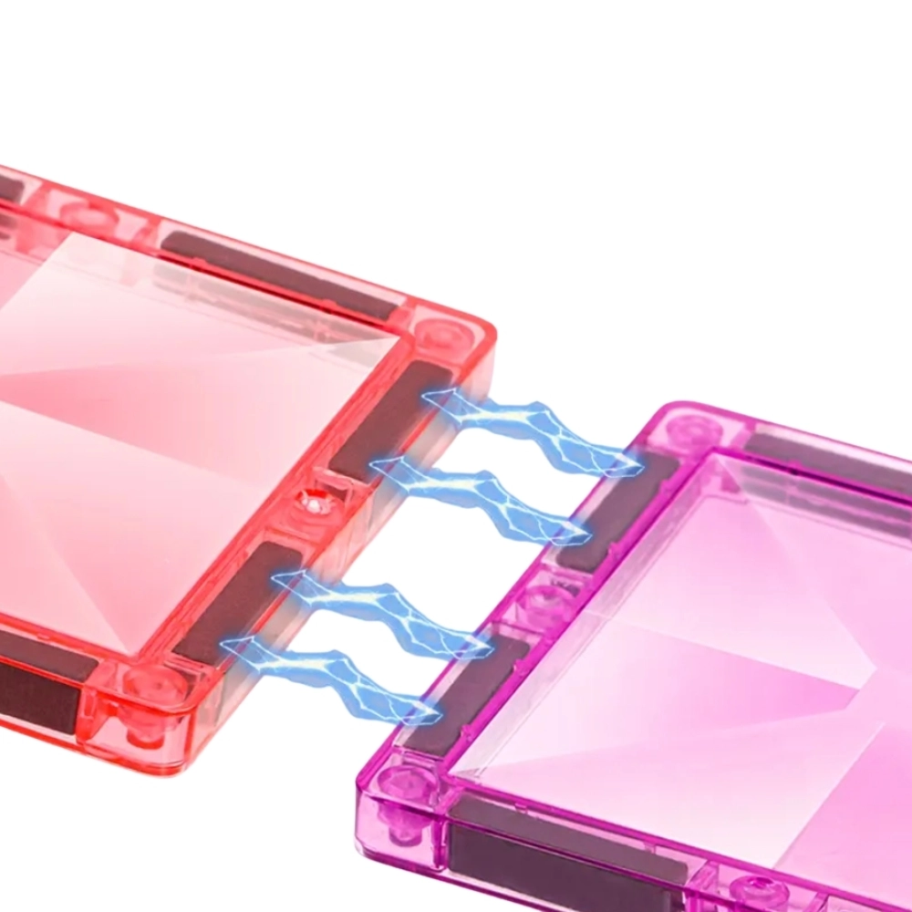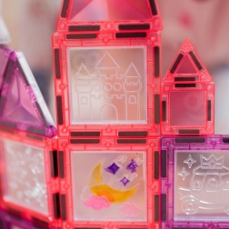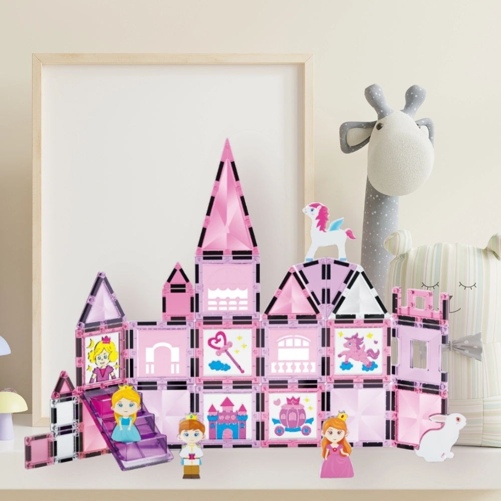 Tato růžovo‑fialová sada magnetických dlaždic a doplňků promění dětskou fantazii v skutečné paláce, věže a brány. Díly s okny, střechami a dekorativními potisky se snadno propojují díky silným magnetům, takže stavby drží tvar a děti si mohou hrát bez frustrace.