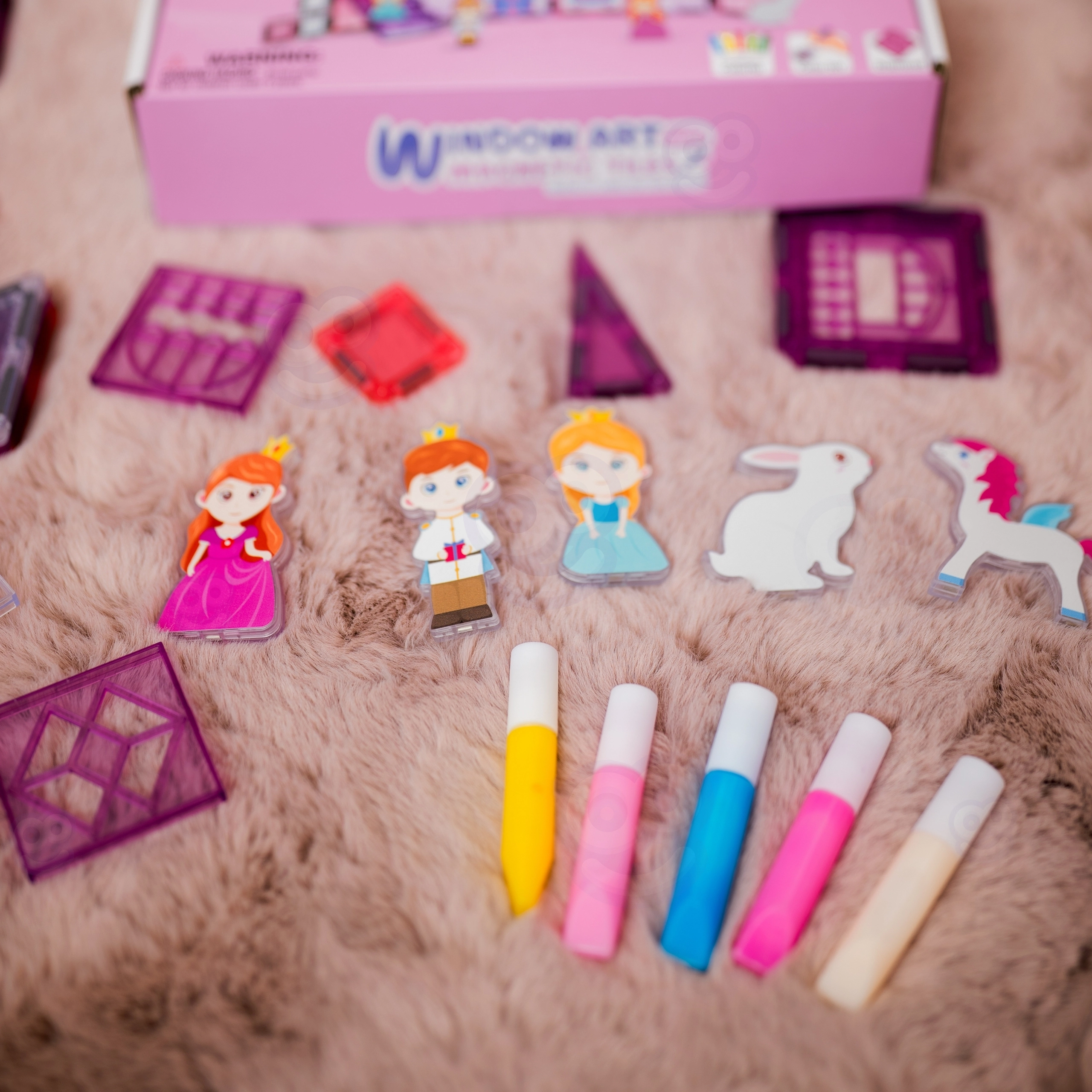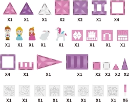 Magnetické dlaždice různých tvarů, okna a střechy, figurky (princezna, princ), jednorožec, dekorativní panely