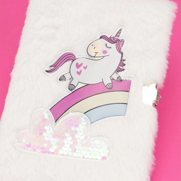 Památník disponuje extra měkkým chlupatým obalem, který je zdobený opalizujícím jednorožcem a perleťovými reversibilními flitry. Tento jedinečný vzhled je ideální pro ty, kteří mají rádi kouzelné a barevné doplňky.